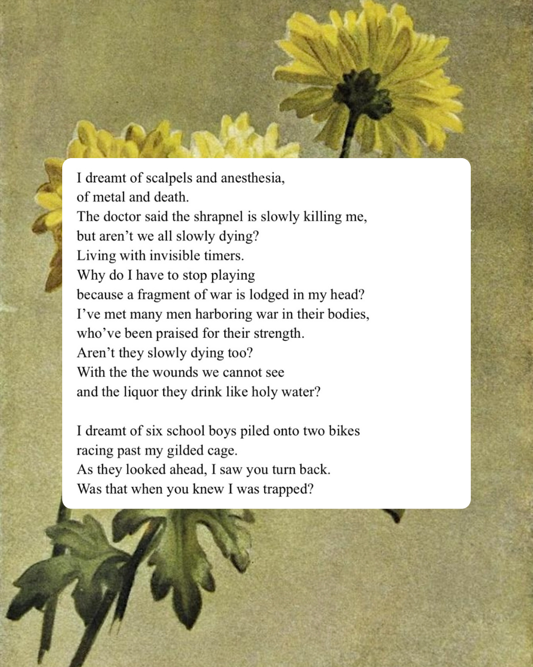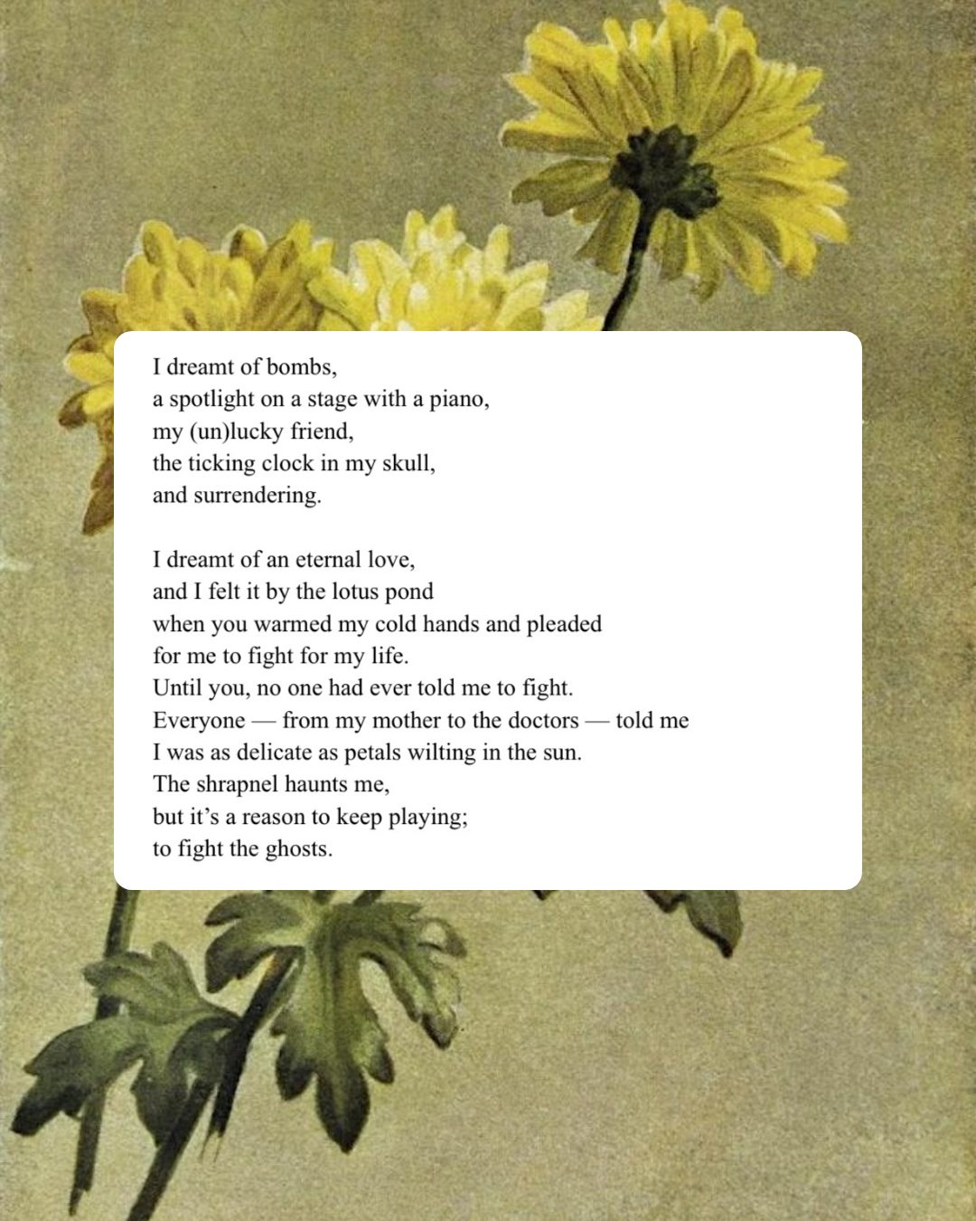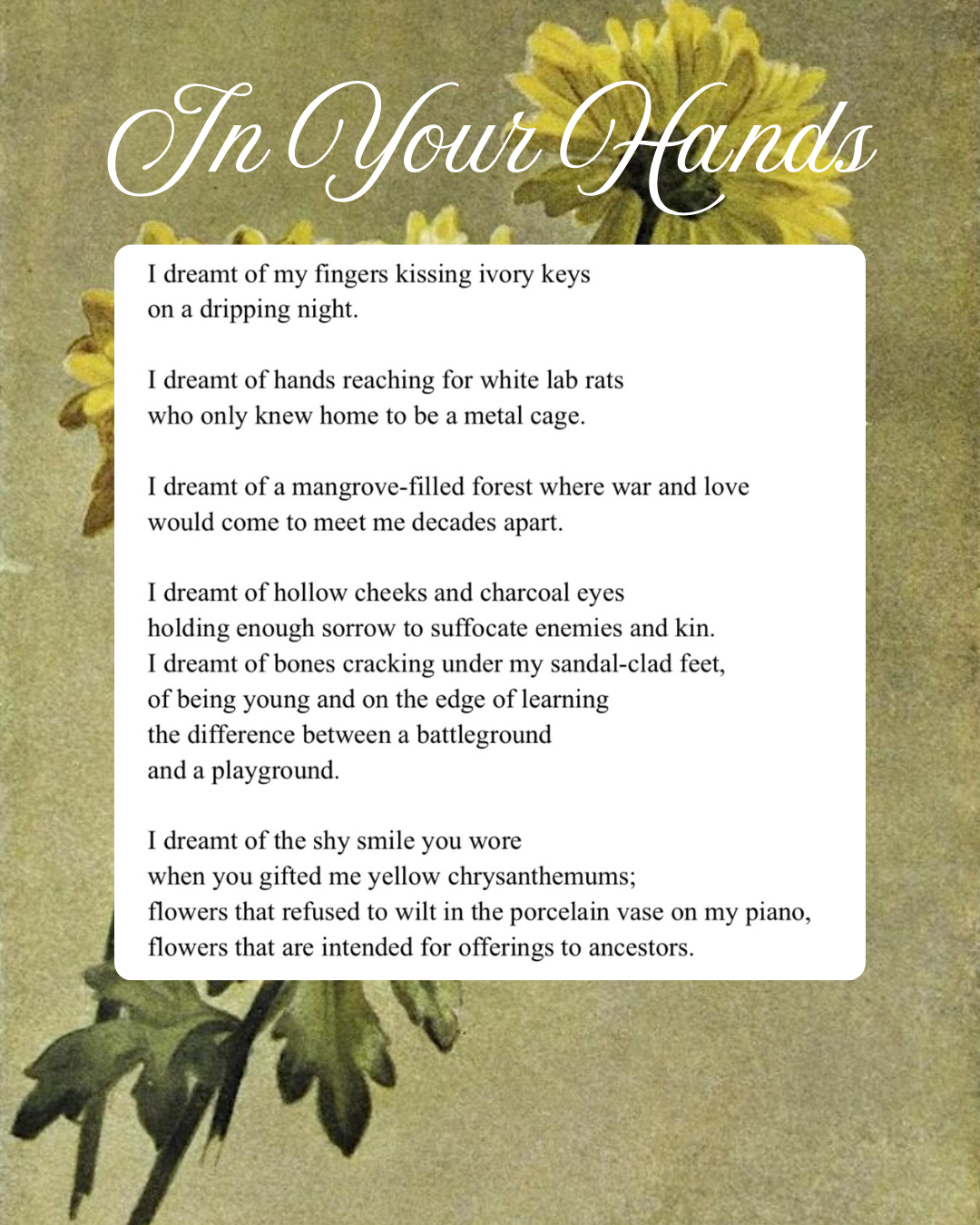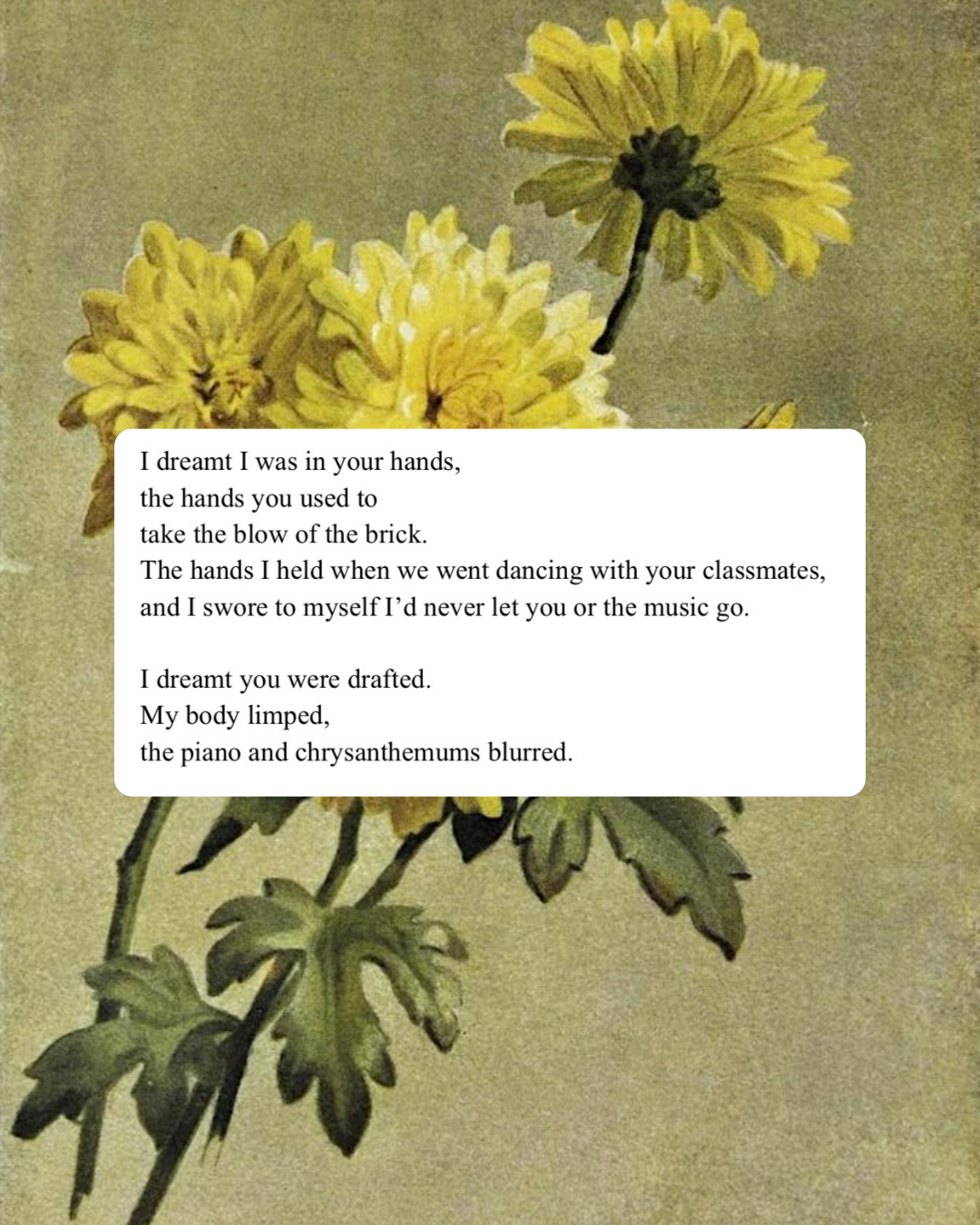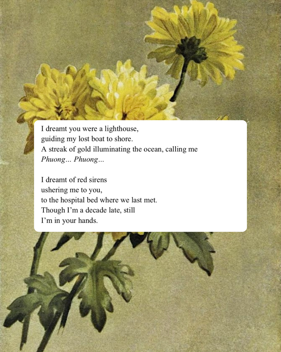 The watercolor illustration in the background is “Yellow Chrysanthemum” (1886) by Maud Naftel. While doing research for my poem, I learned that the yellow chrysanthemum holds a spiritual significance in Vietnam. They are one of the flowers most often placed on ancestor altars.